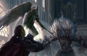 "Rengaine ton épée, mortel. Tu prétends que je suis un monstre qui a souillé le temple de ton dieu. Tu es ignorant de penser que ton dieu a été si pur, car je suis sa création. Je ne suis pas un de ces anges d'albâtre qui se moquent de chacune de ses paroles. Au contraire, je suis quelque chose qu'il a construit à son image, pour ensuite être brisé et jeté en enfer lorsqu'il a échoué. "Maintenant, toi, paladin, tu me tuerais parce que ton dieu l'a exigé ? Si vous le faites, vous détruisez les preuves de l'erreur de votre dieu et perpétuez une nouvelle injustice. Si vous refusez, vous violez les serments que votre patron a exigés, vous condamnant à jamais. Il vous a poussé à l'échec, comme il l'a fait pour moi. "Maintenant, baissez votre arme, et parlons de vengeance."